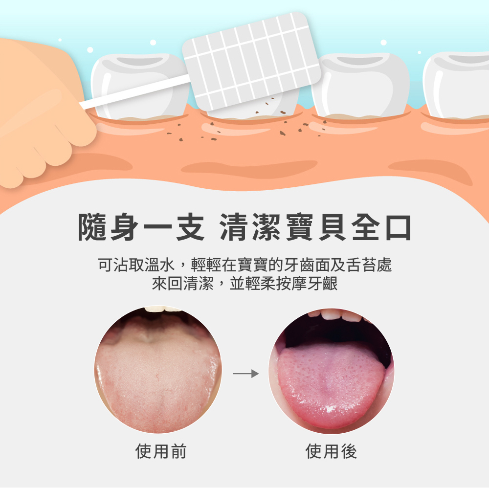 浸潤棉棒後,即可清潔兒童口腔 (舌苔、齒垢)