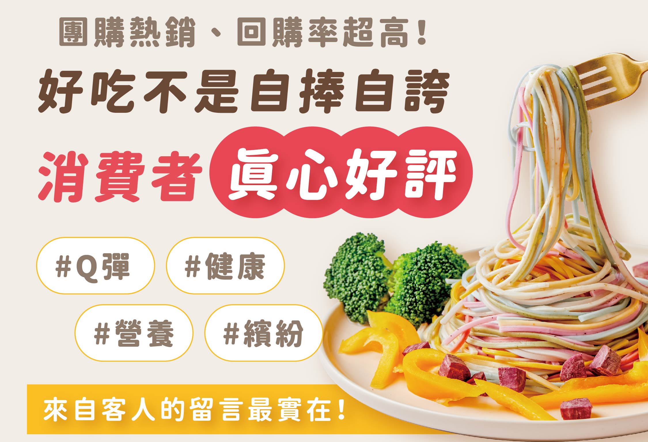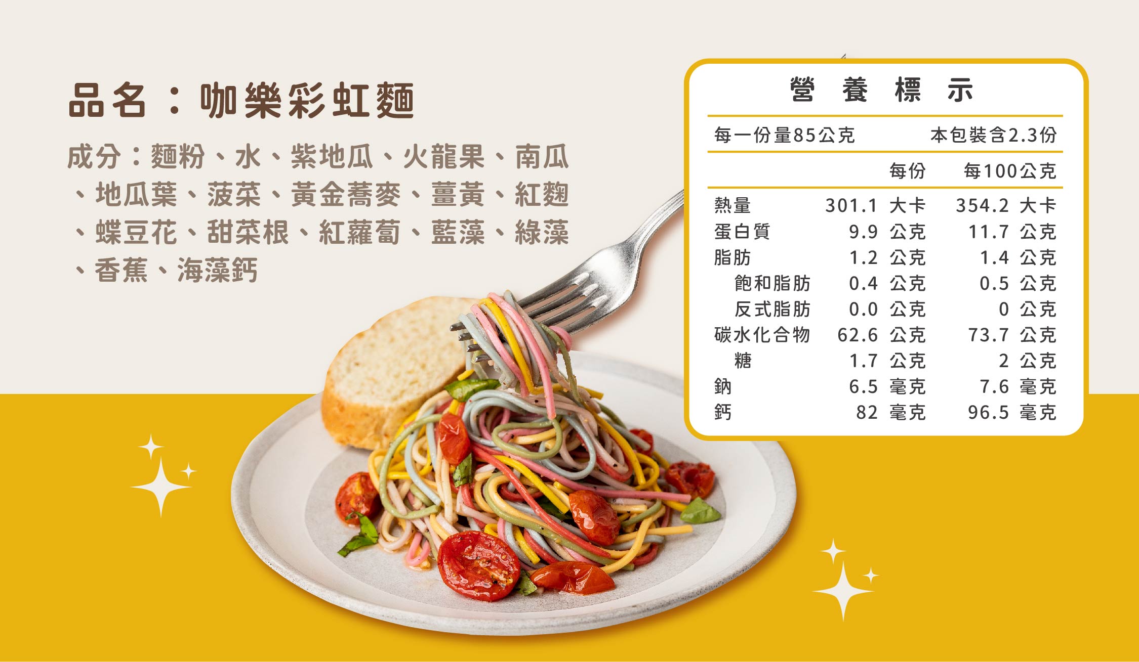 成分:麵粉、水、海藻鈣、蔬果(紫地瓜、火龍果、紅麴、甜菜根、牛番茄、南瓜、紅蘿蔔、南瓜、蝶豆花、蕎麥、菠菜、地瓜葉、 薑黃)、海藻鈣