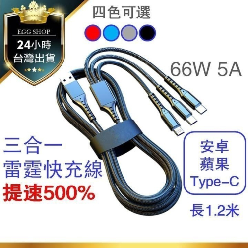 【台灣24H出貨】5A升級66W三合一充電線 一拖三快充線 1.2米編織數據線 安卓 蘋果 ios Type-C 一分三