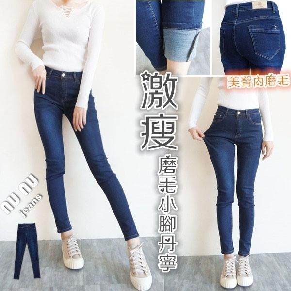 超彈力深藍磨毛丹寧褲 顯瘦小腳款 前後真口袋.鈕釦拉鍊設計 全件磨毛厚度適中 修身效果佳! 冬季甜心必備款!