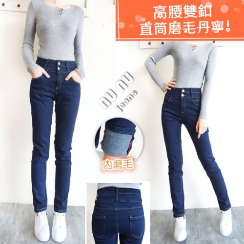 高腰雙真鈕釦 直筒深藍丹寧磨毛款 高腰質感前後褲耳+真口袋 冬季保暖必備牛仔褲.小腿肉肉也沒問題