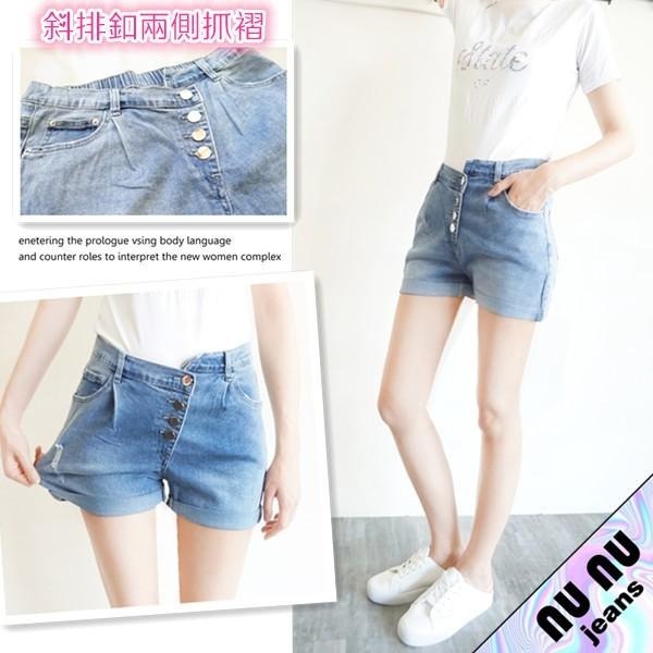不對稱褲頭牛仔短褲 抓褶 花苞褲型 排釦牛仔短褲 捲邊短褲 燈籠褲 休閒短褲 水洗 牛仔褲 NN.362.811