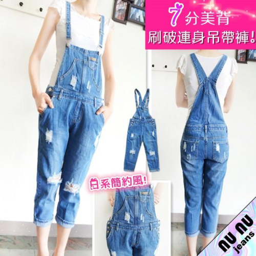 美背七分連身吊帶褲S~XL日系個性膝刷破牛仔褲NO.979-332