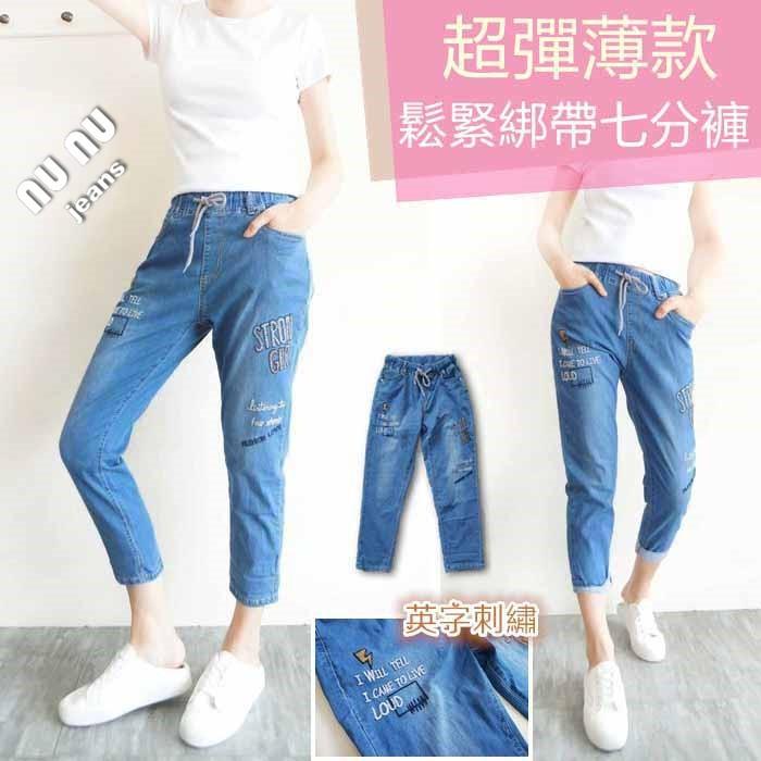 中腰時尚潮流英字|超彈性七分褲|牛仔七分褲|七分牛仔褲|休閒褲|七分褲|哈倫褲|女生褲子.367.330