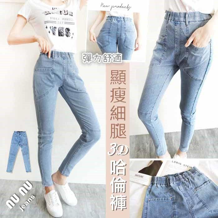 日系水洗淺藍丹寧哈倫褲 /鬆緊彈力牛仔褲/牛仔長褲/休閒長褲/夏天褲子/顯瘦長褲/AB褲.577.369