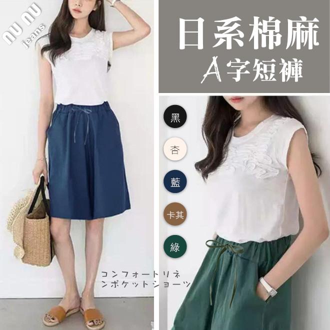 日系棉麻短褲/高腰口袋A字短褲/高腰短褲/棉麻褲/闊腿褲/休閒短褲/休閒褲/棉麻短褲/寬鬆褲子/素色短褲