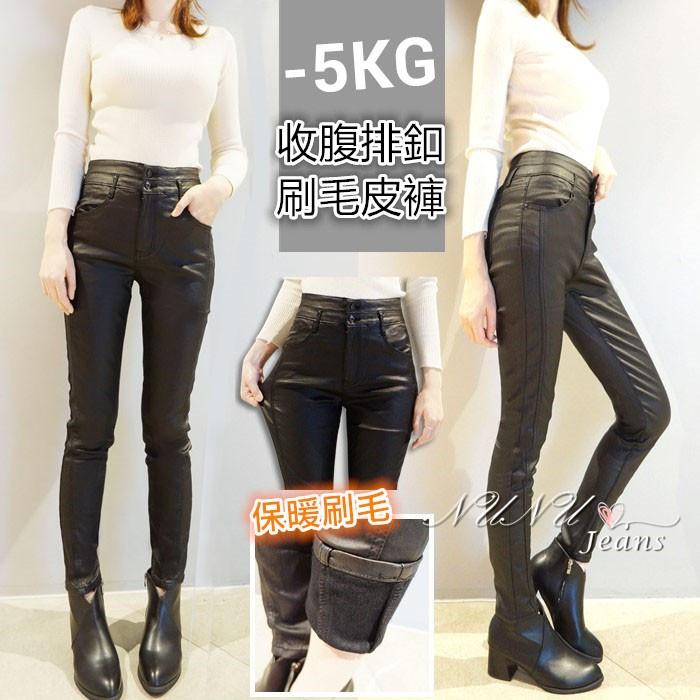 炸瘦-5kg雙釦高腰收腹刷毛皮褲 收腹褲 刷毛褲 皮褲 緊身褲 防水褲 防風褲 重機配件 皮衣 保暖褲.673.609