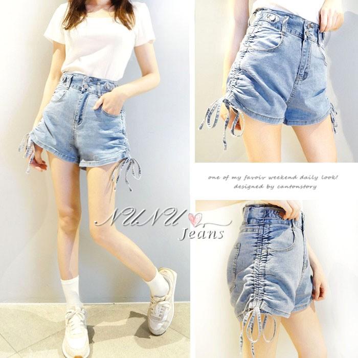 雙釦淺藍牛仔短褲 甜心款捲邊綁帶熱褲 A字短褲 收腹短褲 高腰短褲 辣妹 顯瘦褲子 收腹褲 休閒短褲.577.878