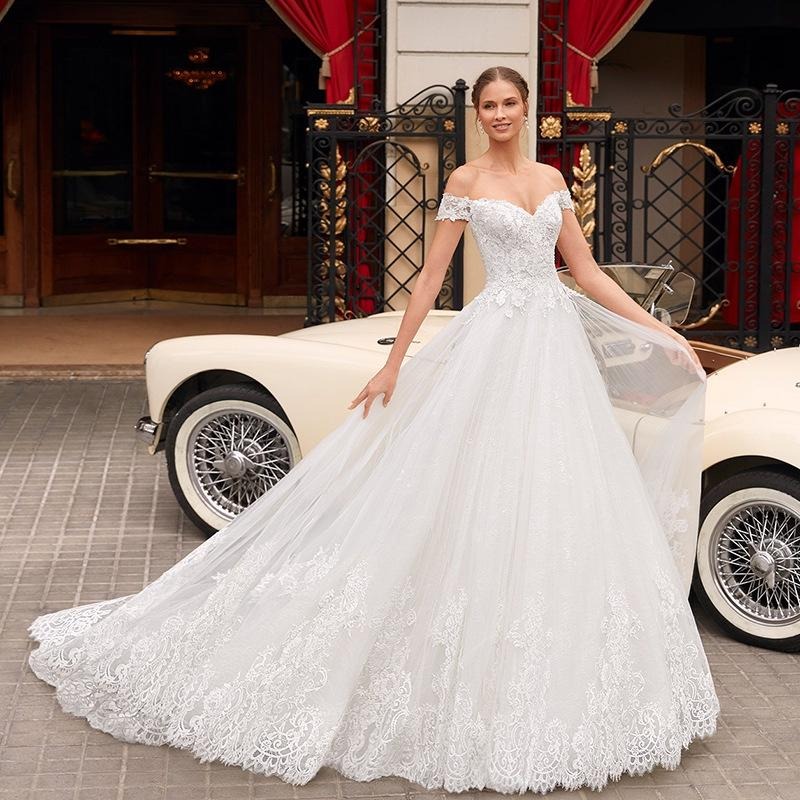 一字肩蕾絲婚紗2023春季新款婚紗新娘水晶紗蓬蓬裙公主風結婚主紗