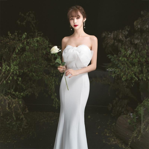 旗艦店白色晚禮服女2023新款抹胸氣質修身名媛高級感魚尾長款主持人禮服
