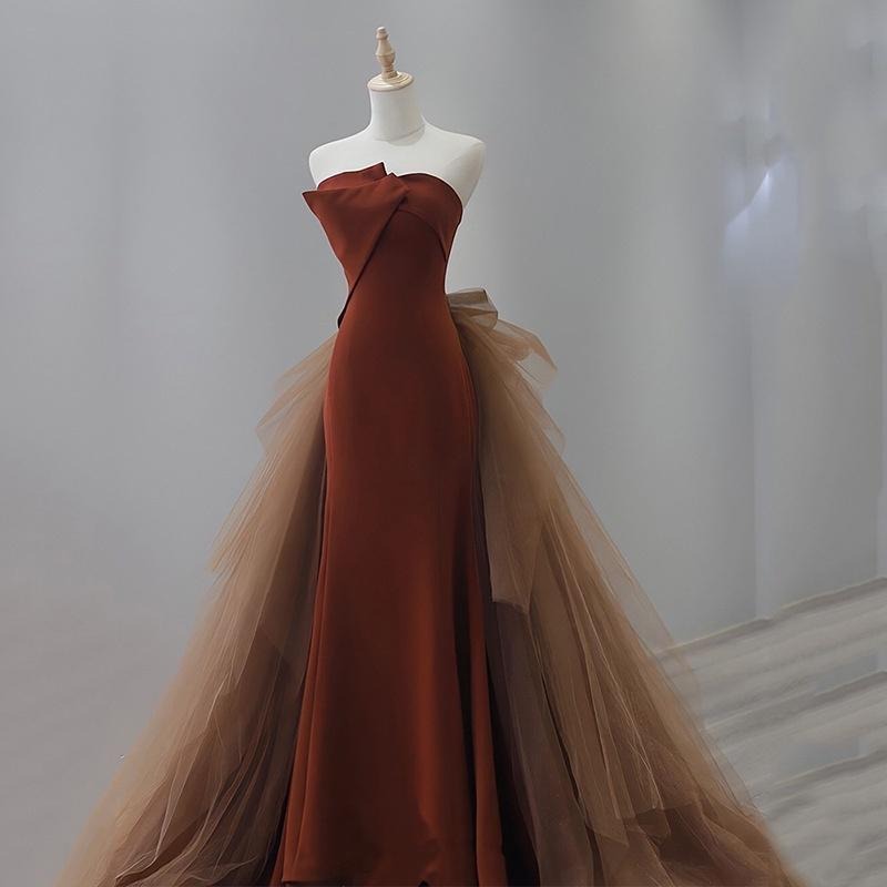 焦糖色魚尾抹胸禮服2023夏季訂婚結婚新娘敬酒服女主持人晚禮服