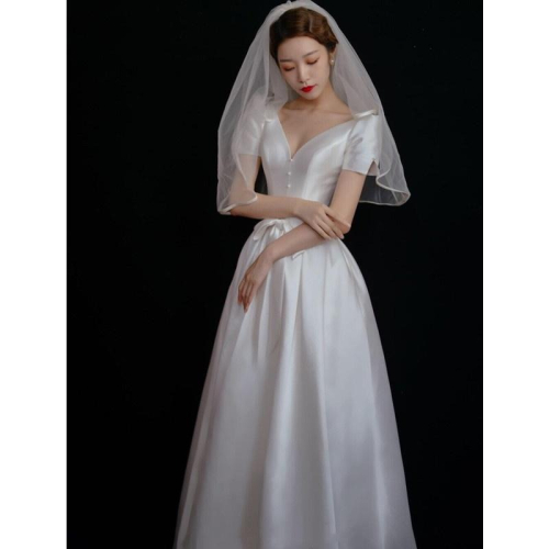 旗艦店緞面輕婚紗復古法式中長款白色顯瘦2023新款新娘短袖赫本風禮服