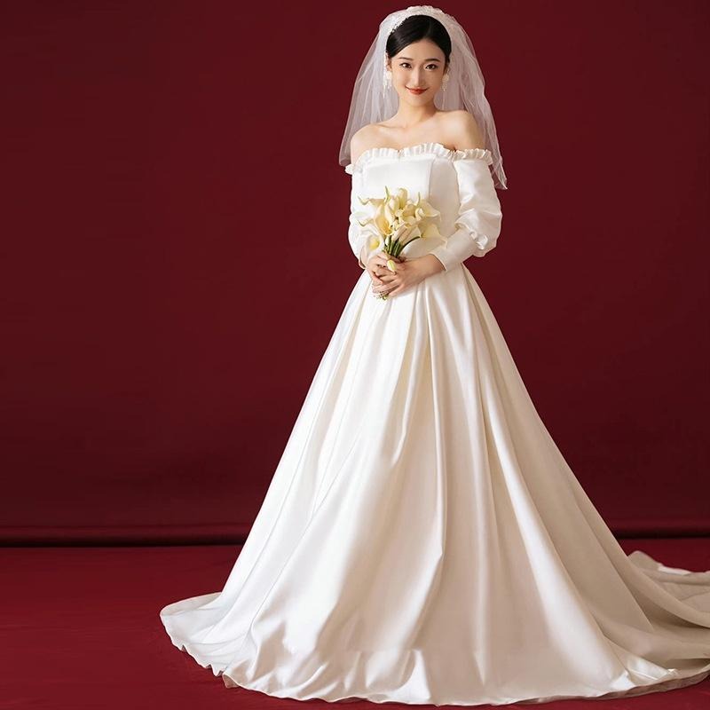 旗艦店法式緞面主婚紗新娘氣質春季一字肩長袖出門輕紗氣質森系超仙禮服