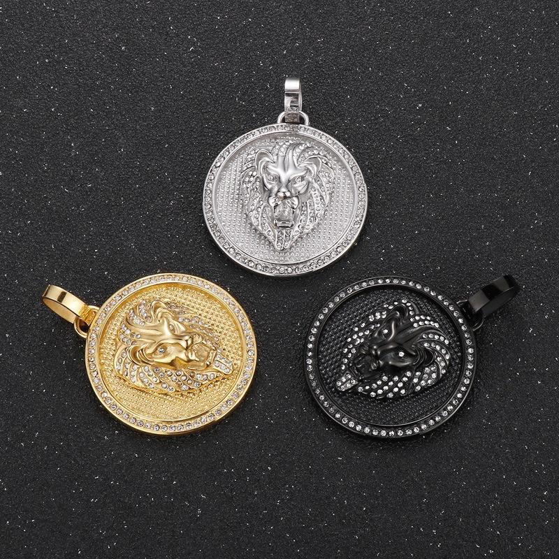 爆款>>搖滾嘻哈圓形吊墜飾品 潮人復古電鍍18k金微鑲鋯石獅子頭男士項鏈