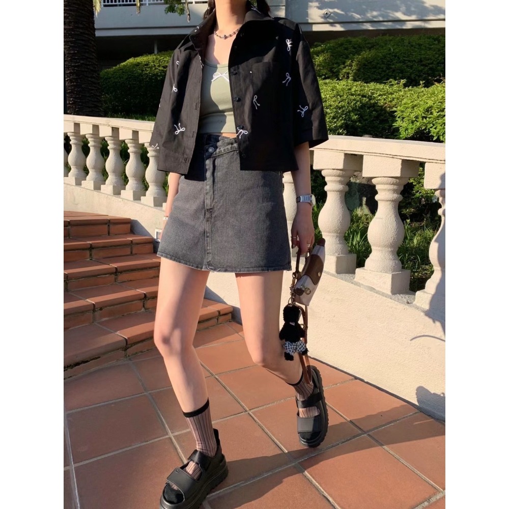 ✈️S現貨-正韓🇰🇷//雪熙歐膩//側釦煙灰牛仔褲裙~6.26