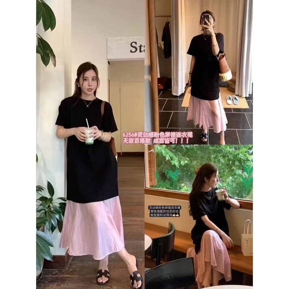 ☑ 黑色T恤+粉色百褶裙拼接,顯瘦又亮眼