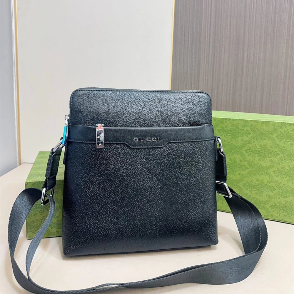 GUCCI包包 男生斜背包 古馳背包 郵差包 黑色荔枝紋牛皮包包 真皮背包 男士背包 大容量小方包 休閒包 旅行包 商務