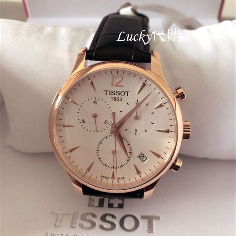 代購Tissot天梭手錶 俊雅系列皮帶男錶 玫瑰金簡約休閒三眼計時日曆防水男士腕錶T063.617.36.037.00