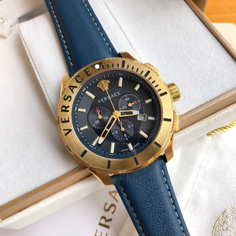 代購Versace手錶男生 凡賽斯手錶 男士石英錶 三眼計時日曆防水男錶 商務通勤休閒皮帶錶 大直徑時尚男生腕錶