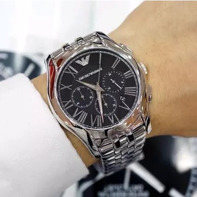 Armani手錶 阿瑪尼手錶男 阿曼尼手錶 AR男士商務休閒腕錶 計時防水不鏽鋼鏈銀色黑面三眼計時日曆男錶AR1786