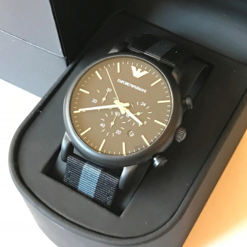 ARMANI手錶 阿瑪尼男錶 AR1948 帆布黑色條紋錶帶 三眼計時日曆休閒商務石英手錶