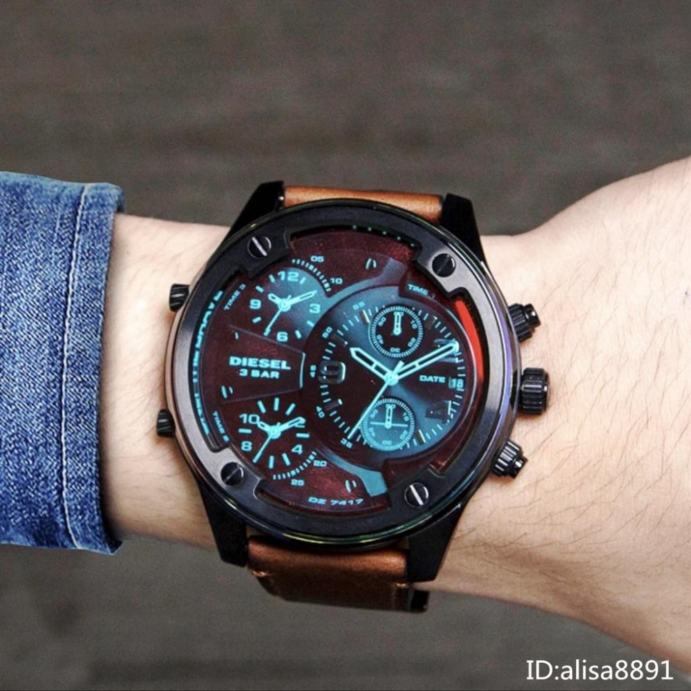 DIESEL手錶 迪賽手錶 棕色皮帶錶 大直徑56mm 變色龍時尚偏光男生腕錶 休閒運動男錶 計時防水石英錶DZ7417