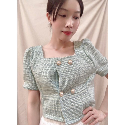 #韓#小香風#小香風衣服#春天上衣#春天外套#韓風#珍珠上衣#珍珠短上衣#珍珠外套#露腰短上衣#泡泡袖短上衣