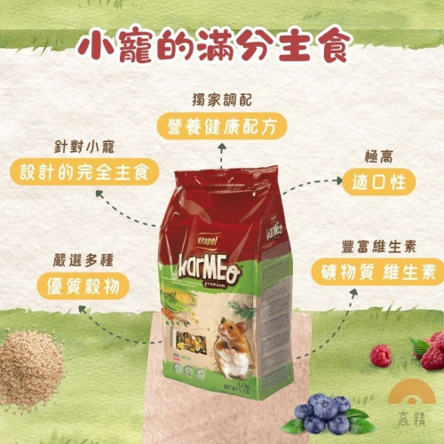 特色:精選多種優質穀物與苜蓿粒,含豐富維生素、礦物質與纖維素。花生能亮麗毛髮、心血管保健,防風草增加自然抵抗力、幫助維持消化道機能、促進食慾,是針對寵物鼠設計的完全主食。
