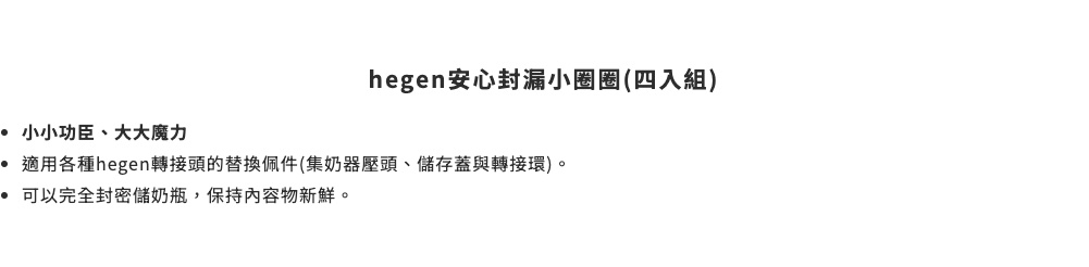品名:【hegen】 安心封漏小圈圈 四入組 產品尺寸:70x70x40 mm 產品重量:約27g 包裝尺寸:約72x73x43 mm 包裝重量:約44g 材質:矽膠 產地:馬來西亞 包裝內容物:安心封漏小圈圈*4 |