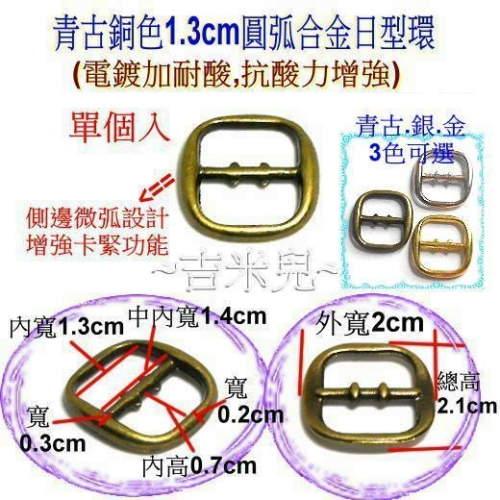 商品:1.3cm圓弧合金日型環----價格:1個=8元 尺寸:內寬1.3cm(可穿織帶寬) 顏色:金色.銀色.青古銅色---3色可選 (+耐酸電鍍) 材質:鋅合金 <<精品時尚,一體成型圓弧弧角設計>> ~台灣製~ ***MIT 優質電鍍技術 不易剝落***
