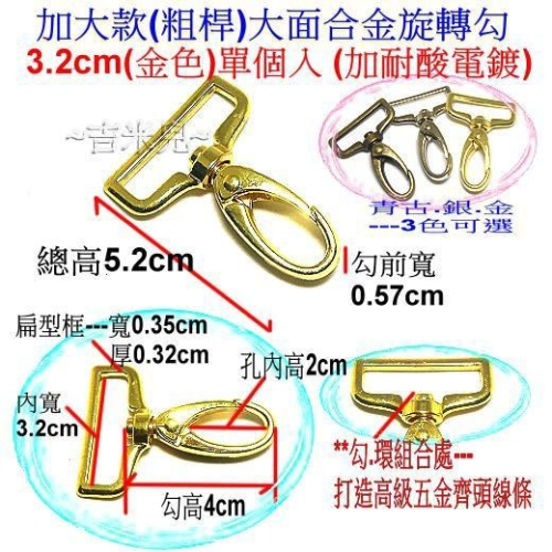 商品:3.2cm加大款(粗桿)大面合金旋轉勾=>售價:1個=35元 <環內寬3.2cm(適用織帶寬) / 勾內孔高:2cm / 勾總高度:5.2cm> 商品:3.8cm加大款(粗桿)大面合金旋轉勾=>售價:1個=40元 <環內寬3.8cm(適用織帶寬) / 勾內孔高:2cm / 勾總高度:5.35cm> 顏色:青古銅色.銀色.金色---3色可選 (金色 : 青銅+耐酸電鍍) 材質:鋅合金 <<高級五金工藝時尚>> 1. 勾.環組合處----打造高級五金齊頭線條. 2. 加大.加粗.扁長方造型 ~台灣製~ ***MIT 優質電鍍技術 不易剝落***