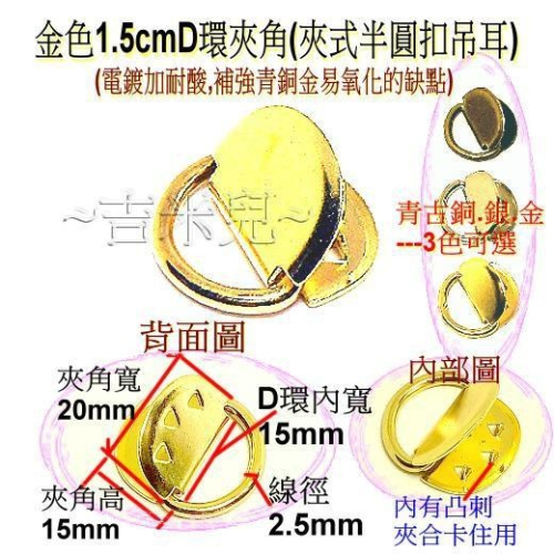 商品:內徑1.5cmD環夾角(夾式半圓扣吊耳)----價格:1個=12元 D型環尺寸:內徑1.5cm 半圓夾角尺寸:最外寬20mm*高15mm ~~0.08cm夾片加強厚度+內部凸刺設計,咬合緊不會鬆開~~ 顏色:青古銅色.銀色.金色---3色可選 金色 (青銅金+耐酸電鍍) 材質: 鐵 (耐酸防鏽電鍍) **安裝方法:放入安裝位置,用力下壓閉合,正面平貼平面,以鎚子下敲 ***樣品包示範:鑰匙圈零錢包*** ~MIT 台灣製~