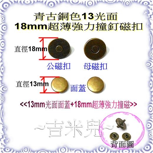 商品:青古銅色13光面18mm超薄強力撞釘磁扣----價格:1組=17元 商品:青古銅色Just For You12雙葉18mm超薄強力撞釘磁扣----價格:1組=20元 商品:青古銅色12圓面愛心18mm超薄強力撞釘磁扣----價格:1組=20元 商品:青古銅色13幸運草18mm超薄強力撞釘磁扣----價格:1組=20元 商品:青古銅色12銅質圓面玫瑰18mm超薄強力撞釘磁扣----價格:1組=22元 商品:青古銅色15圓面愛心18mm超薄強力撞釘磁扣----價格:1組=22元 (含公扣*1個+母扣*1個+撞釘面蓋*2個) 磁扣直徑:18mm(=1.8cm) 厚度:公扣1mm&母扣2mm 品質優.超強吸力 **圖七----為撞釘磁扣工具使用安裝法** **圖八----為撞釘磁扣綜合圖 及 工具底座搭配使用法說明** ~台灣製~ ***MIT 優質電鍍技術 不易剝落*** ***備註說明*** 可使用 撞釘磁扣工具組(含斬+座台)+打洞斬 安裝敲打使用 打洞斬尺寸<<布料選用2號(2.5mm);皮革選用4號(3.5mm)>> <<打洞斬屬消耗品,要延長保護刀口==>需搭配適合底墊使用喔>>