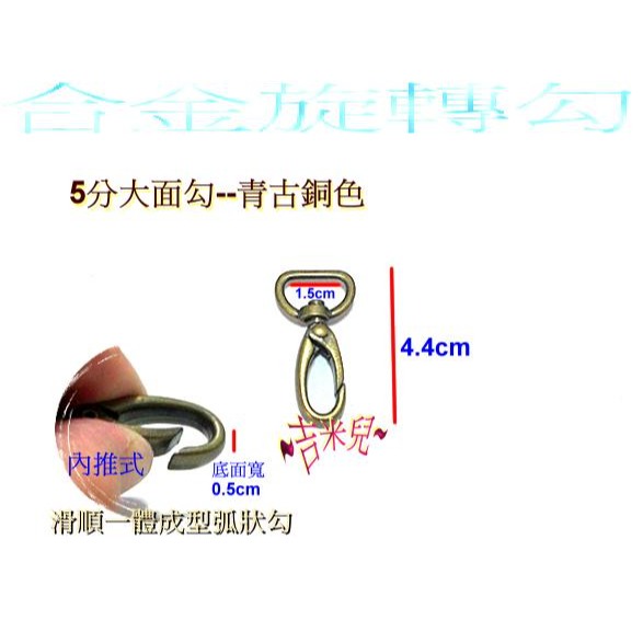 商品:1.5cm(5分)大面合金旋轉勾----價格:1個=16元 尺寸:1.5cm(適用織帶寬) 顏色:青古銅色.銀色----2色可選 **滑順一體成型弧狀勾** 大面勾底寬:0.5cm 材質:鋅合金 ~台灣製~ ***MIT 優質彈簧 電鍍技術穩定 不易剝落***