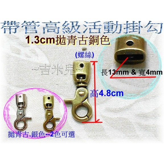 商品:內徑1.3cm(4分)鋅合金帶管高級活動掛勾(螺鎖式) 價格:1個=40元 <含掛勾*1個+螺絲*1個> 顏色:拋青古銅色.銀色---2色可選 (高級耐酸吊電) 掛勾含管總高:4.8cm 管內長方尺寸:長1.3cm*寬0.4cm <可放入寬1.2~1.3cm , 厚度0.2~0.4cm 的皮革.織帶,以所附螺絲鎖上> 材質:鋅合金 特性:高級電鍍 + 耐酸+螺鎖式設計 **外開式設計,可用於雞眼密閉圈環使用** ~台灣製~ ***MIT 優質合金 電鍍技術穩定 不易剝落***