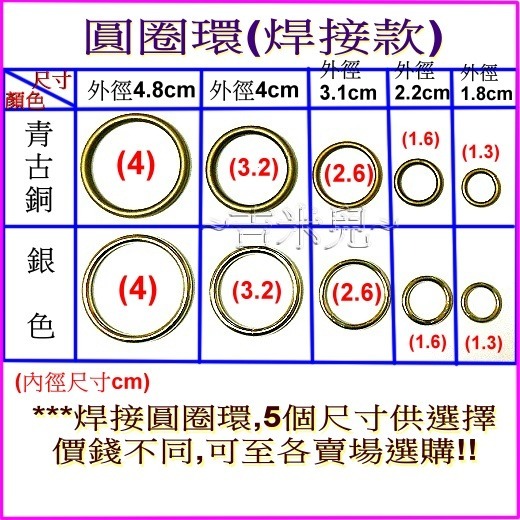 商品:外徑4.8cm圓圈環----價格:1個=10元 <尺寸:線徑0.4cm*內徑4cm*外徑4.8cm> 商品:外徑4cm圓圈環----價格:1個=8元 <尺寸:線徑0.4cm*內徑3.2cm*外徑4cm> 商品:外徑3.1cm圓圈環----價格:1個=6元 <尺寸:線徑0.3cm*內徑2.5cm*外徑3.1cm> 商品:外徑2.2cm圓圈環----價格:1個=5元 <尺寸:線徑0.3cm*內徑1.6cm*外徑2.2cm> 商品:外徑1.8cm圓圈環----價格:1個=5元 <尺寸:線徑0.25cm*內徑1.3cm*外徑1.8cm> ****圓圈環規格----可參考各尺寸圖示**** 顏色:青古銅色.銀色----2色可選 材質:鐵+防鏽電鍍 ~台灣製~ ***MIT 優質電鍍技術 不易剝落***