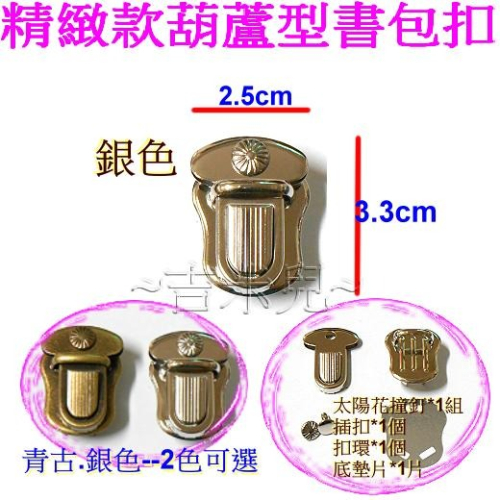 商品:台灣製精緻款葫蘆型書包扣插鎖-售價:1組=30元 (青古銅色.銀色-2色可選) (含插扣*1個+8*8太陽花撞釘*1組+扣環*1個+底墊片*1片) 商品:大陸製葫蘆型書包扣插鎖(青古銅色)-特價:1組=20元 (含插扣*1個+8*8撞釘*1組+扣環*1個+底墊片*1片) ***扣合後外觀尺寸:寬2.5cm*高3.3cm*** 材質:鐵+防鏽電鍍 <<書包插鎖式---袋蓋創意設計>>