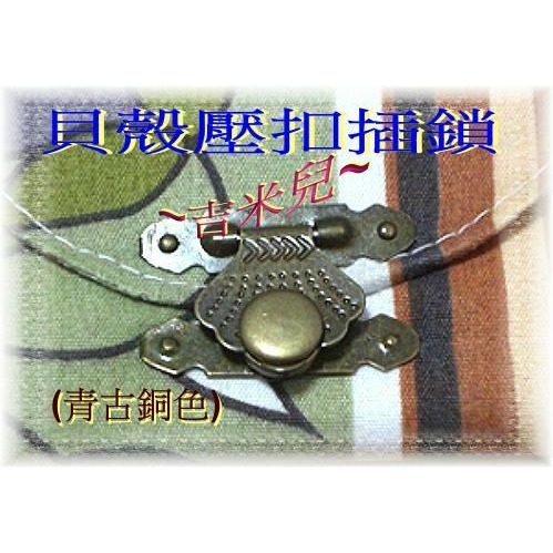 商品:貝殼壓扣插鎖/四合扣插鎖(青古銅色)----價格:1組=25元 (含貝殼壓扣上扣*1個+下扣*1個) 顏色:青古銅色 外觀尺寸:寬3.4cm*高2.2cm 插腳長:1.1cm 材質:鐵 特性:不需特殊工具即可安裝 ~台灣製~ ***貝殼壓扣插鎖設計*** 布紙盒.小夾包...使用創作 , 展現精品精緻風格~