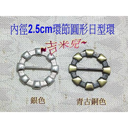 商品:內徑2.5cm環節圓形日型環----價格:1個=20元 ***顏色:拋青古銅色.銀色---2色可選*** 尺寸:外徑4cm&內徑2.5cm (適穿織帶寬:2.2cm~2.5cm) 材質:鋅合金 ~台灣製~ ***做日環功能調節背帶長,或包包蓋片.身片裝飾創作***