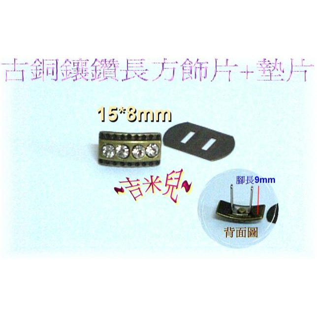 商品:鋅合金古銅鑲鑽長方飾片+墊片(插式飾扣)-價格:1個=20元 顏色:青古銅色 材質:鋅合金 外觀尺寸:寬15mm&高8mm 飾片腳長:9mm 特色:鑲嵌4顆2.5mm奧地利水鑽 ~台灣製~ ***MIT 電鍍技術穩定 不易剝落*** <<<安裝方式:插入式>>> 1.以錐子刺兩洞,將飾片腳由表面向裡面插入. 2.從背面將墊片套入飾片腳. 3.飾片腳做內摺=>完成 ***古銅優雅造型***