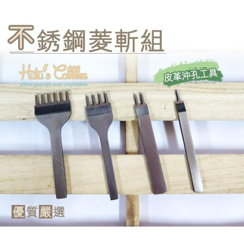 菱斬 皮革縫製時的沖孔工具 可筆直的沖多個排孔 不銹鋼材質 孔狀為斜菱形 菱斬是消耗品,如刀片,剪刀一樣用久了會鈍喔 共四種規格 3mm 4mm 5mm 6mm 每組有四支 1孔 2孔 4孔 6孔 詳細規格: A01 3mm間距(齒面1.5mm)適合皮革較薄的小物件,例如鑰匙包和比鑰匙包更小的皮具。 A02 4mm間距(齒面2.0mm)適合皮革中等厚度的中物件,例如鑰匙包和錢夾大小的皮具。(最常用) A03 5mm間距(齒面2.5mm)適合皮革中等偏厚的中大物件,例如錢夾到各種大的背包大小的皮具。 A04 6mm間距(齒面3.0mm)適合厚皮革的大物件,例如各種大的背包馬鞍等大的皮具。 中國製造 使用方式 1.打孔時菱斬一定要垂直於皮面,防止因菱斬傾斜而打斷斬齒! 2.捶打菱斬時最好不要使用鐵錘,可使用橡膠錘 3.皮下最好墊以軟物,以保護斬尖,推薦使用出格板或開料板! 4.菱斬不用時,可將斬間塗上一層黃油,套上膠套以做防護與保養