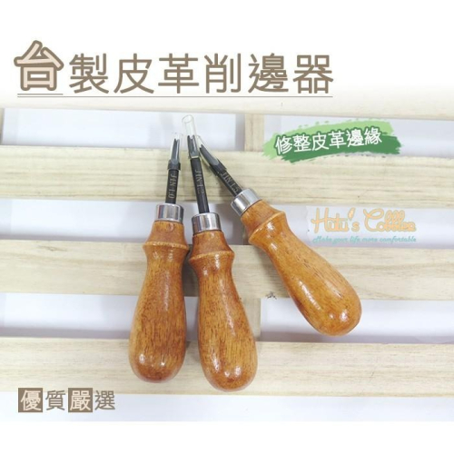 皮革削邊器 修邊器 台灣製造 全長約15cm 握柄長約9.5cm 規格 A01 刀口寬1.0mm A02 刀口寬1.2mm A03 刀口寬1.5mm 修整皮革邊緣用,使皮革邊緣更加滑順漂亮 使用方法: 握好握柄,凹槽對準皮革邊緣,施力往前推,保持固定角度才會漂亮。