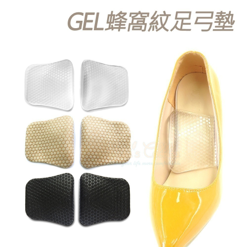 填補足弓空隙貼合支撐 GEL蜂窩紋足弓墊特色: GEL材質,能吸收衝擊 親膚觸感,柔軟承托 背膠黏貼,防滑固定 材質:GEL、絨布