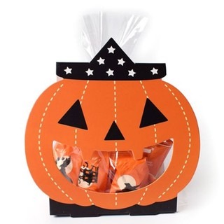 把糖果裝進透明OPP袋裡,用扎絲封口,放進紙卡裡,袋子頂端從南瓜紙卡的三角孔裡拉出,然後把紙卡插好固定住,就完成囉。