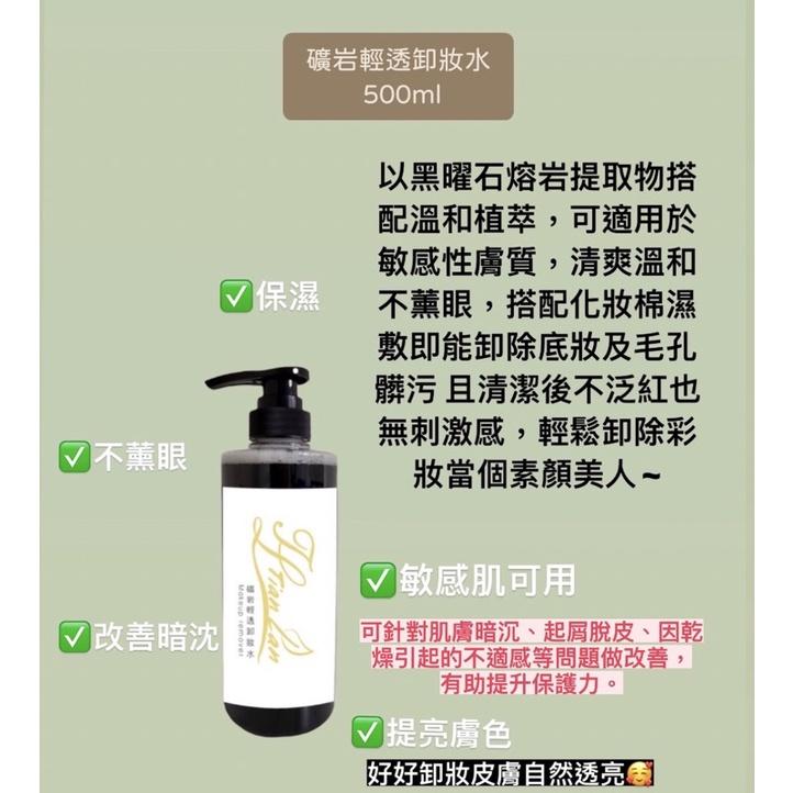 品名:礦岩輕透卸妝水 容量: 500ml 【主成分】:冬蟲夏草、雲芝提取物、糖基海藻醣、金銀花提取物、高山黃芩、竹炭粉、黑曜石熔岩提取物、PCA天然保濕因子。 【用途】:以黑曜石熔岩提取物搭配溫和植萃,可適用於敏感性膚質,清爽溫和不薰眼,搭配化妝棉濕敷即能卸除底妝及毛孔髒污 且清潔後不泛紅也無刺激感,輕鬆卸除彩妝當個素顏美人 【用法】:1.卸除眼妝,將沾滿卸妝水的化妝棉靜置於眼妝部位數秒後,然後使用化妝棉在眼妝部位輕柔拭去眼妝 2. 全臉用:取適量於化妝棉上,輕輕擦拭於臉部彩妝與髒汙處,再以清水潔膚。 https://s-cf-tw.shopeesz.com/file/tw-11134208-7qul0-lfaonya99wz38d