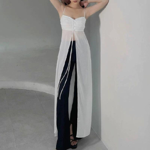 【仙女試衣間】預購🤍 法式超仙 🤍「鈕扣繫帶吊帶連衣裙」單穿就超級美 設計感小眾性感露背渡假風拼接長裙