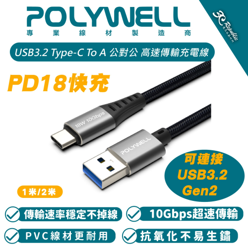 🔷商品名稱:POLYWELL USB3.2 Type-C To A 公對公 高速傳輸充電線