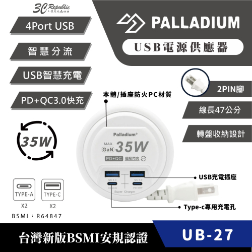 🔷商品名稱:Palladium 35W USB超級閃充電源供應器 UB-27
