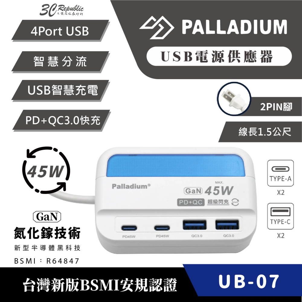 🔷商品名稱:Palladium 45W USB超級閃充電源供應器 UB-07