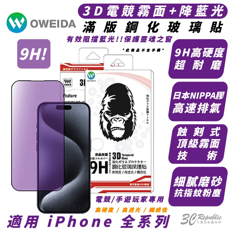 🔷商品名稱:Oweida iPhone 全系列 3D電競霧面+降藍光 滿版鋼化玻璃貼